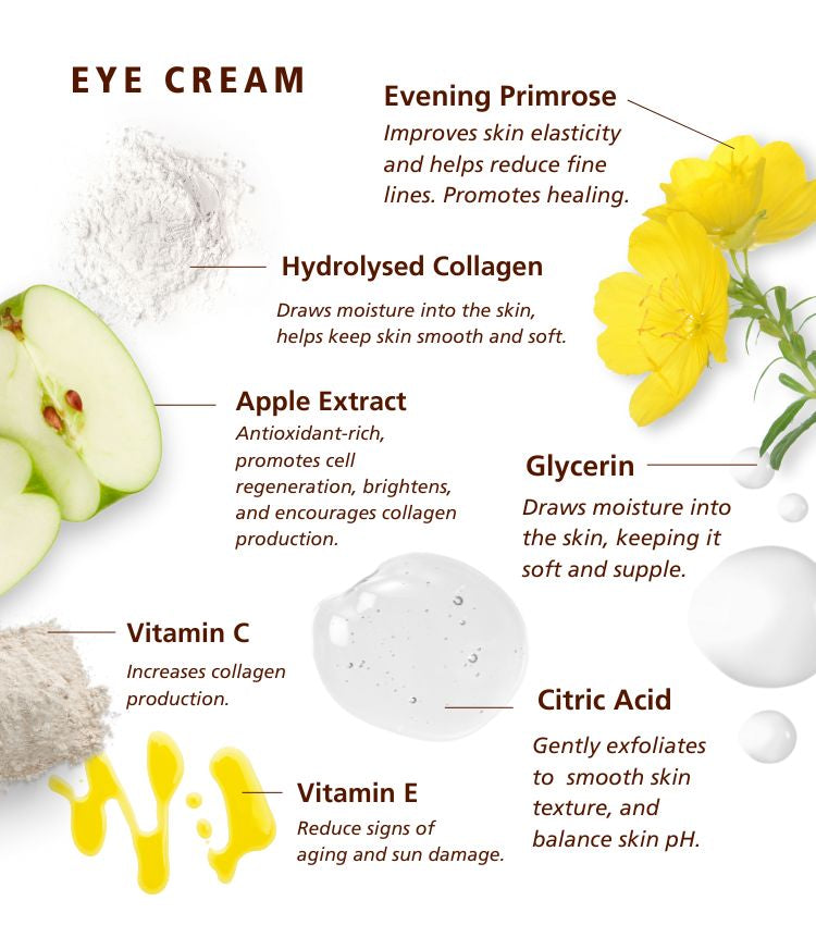 Eye cream is a rejuvenating blend of ingredients infused with the anti-ageing benefits of apple extract to revitalize the skin. Reduces the appearance of fine lines and wrinkles while improving the texture, tone and colour of the skin around the delicate eye area.