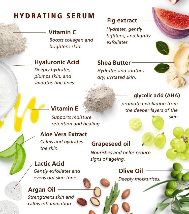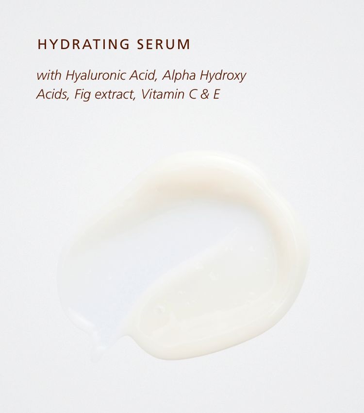 Key Ingredients: Hyaluronic acid draws moisture into the skin. Increases firmness and pliability of the skin. Argan oil helps the skin retain its moisture. Grape seed oil help prevent pores clogging. Olive oil softens and hydrates the skin. Vitamin C & E protects from free radicals. Fig extract regulates trans-epidermal water loss. Shea Butter hydrates the skin. Glycerin has a cooling effect on the skin. Lactic Acid hydrates and evens out skin tone. Glycolic Acid assists with cell renewal.