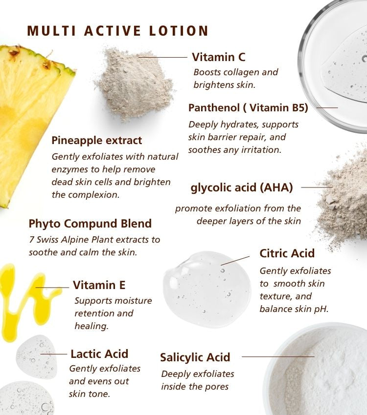 Key Ingredients: Salicylic acid Treats acne, blackheads, redness and inflammation. Citric Acid assists with collagen production. Pineapple extract accelerates exfoliation and helps the skin maintain its moisture. Panthenol (Vitamin B5) works as an anti-inflammatory and calms irritated skin. Vitamin C & E protects from free radicals. Phyto Compound Blend is a blend of 7 Swiss alpine plant extracts to hydrate, cool and heal the skin. Glycerin has a cooling effect on the skin. Lactic Acid hydrates and evens out skin tone and improves the appearance of hyper pigmentation. Glycolic Acid assists with cell renewal and improves the appearance of fine lines and wrinkles.